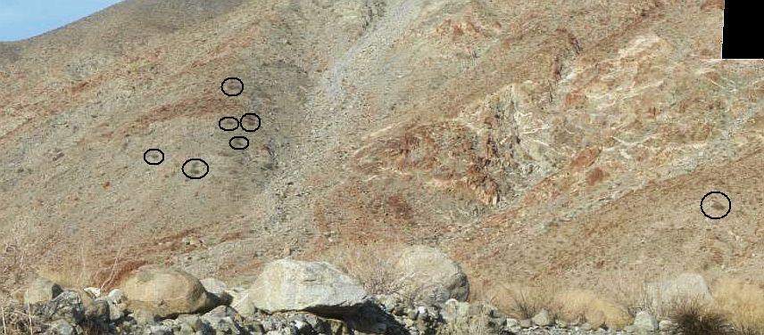 The Elephant Tree herd in the Santa Rosa Mountains on the east side of Clark Valley was not discovered until the early 1980s, and there is little easily-available information about their location other than northeast of Clark Well, toward Barton Canyon (Lindsay and Lindsay 2002, p. 99). Someone in the Park Service undoubtedly has GPS coordinates of this herd, from a dedicated helicopter survey with GIS capabilities in January 2000, but we were unsuccessful in several attempts to obtain the coordinates. That helicopter survey estimated the herd contained over 160 individuals (Lindsay, Anza-Borrego A to Z, p. 154).