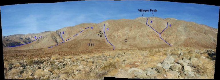 The map also numbers the main drainages in this area, which are shown in the next photograph, along with a small hill labeled 1631 (feet) on the topo map (the label Elephant Tree obscures the 1631 in the topo map above, but the ridge extending to the west / southwest can be seen under that label):