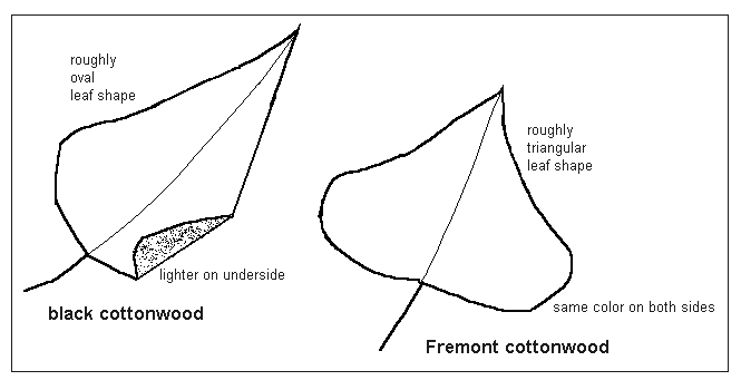 - The Black Cottonwood leaf shape should be more elongated, with a tapered, not flat, base. See Distinguishing Fremont and Black Cottonwood.