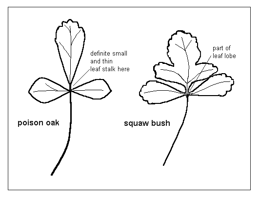 - The middle leaflet for squaw bush should not have a stalk separating it from the other two leaflets. See Distinguishing Poison Oak and Squaw Bush.