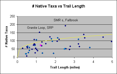 The following figure plots the number of native taxa as a function of unique trail distance. High altitude trails, with a mean elevation above 4000 feet, now are marked with a blue cross inside their filled blue diamond. The yellow curve shows the usual power law increase of the number of species with area. (See Number Of Taxa Vs. Trail Length For Trails In Our Master Database; the curve plotted here is the same one fitted to my more complete trail guides in 2002.)