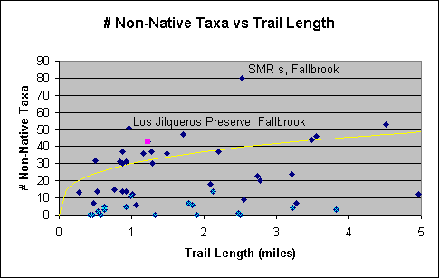 The following figure shows the number of non-native taxa as a function of unique trail distance.