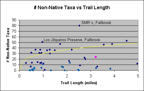 The following figure shows the number of non-native taxa as a function of unique trail distance.