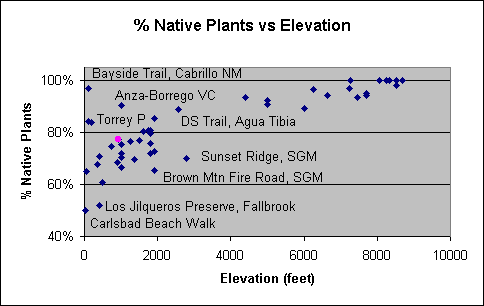 For its elevation, the percentage of native taxa is surprisingly high compared to the other trails in our database.