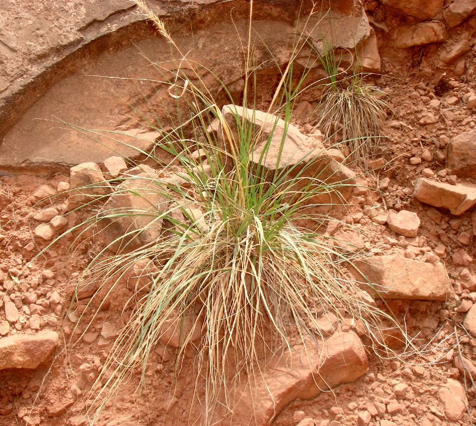 Achnatherum scribneri is a somewhat-similar species that has been reported growing from near the location of these plants. The 1987 Grand Canyon Flora says that A. scribneri grows on dry, rocky slopes along Bright Angel Trail, and north Kaibab Trail to Roaring Springs, Inner Canyon. Kearney and Peebles report that Hitchcock 10448 is of A. scribneri from the Bright Angel Trail between 5000 and 7000 feet elevation. (That voucher is not online at SEINet, so I can't check whether the determination of that voucher has changed.) Oddly, though, USDA Plants does not place A. scribneri in Arizona. There is only a single online voucher of A. scribneri from the Coconino County portion of the Grand Canyon, from 2.5 mile down the Kaibab Trail from the south rim.