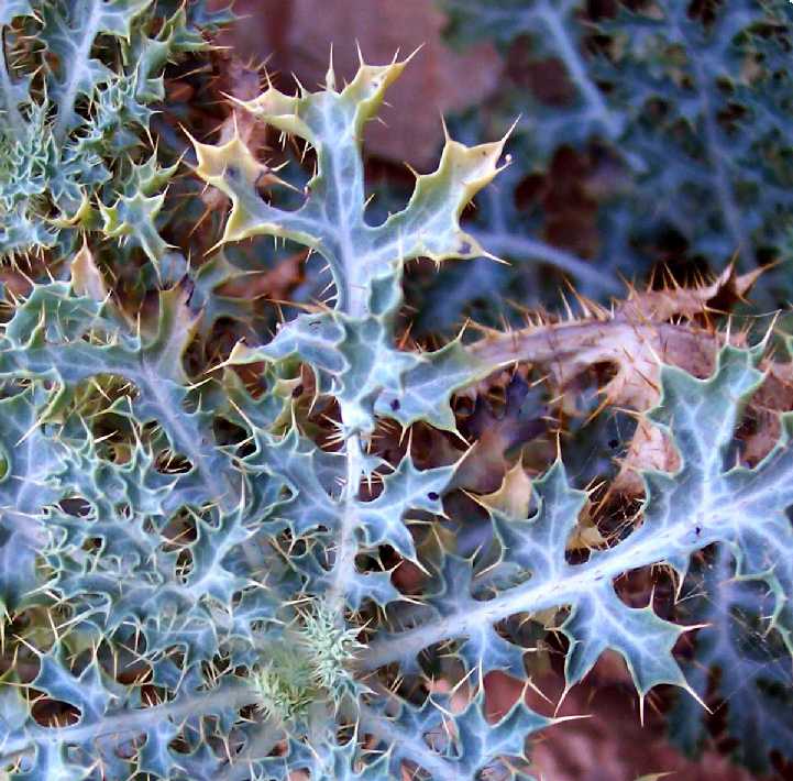 My pictures below clearly show that the leaves are lobed nearly to the midrib, the lobes are narrow, and the leaves are prickly only on the veins. Thus all three of his distinguishing characteristics that I can measure on my pictures go to A. arizonica. (I observed decumbent stems, again consistent with A. arizonica, but they are old stems and I cannot rule out that they were erect when they were in bloom.)
