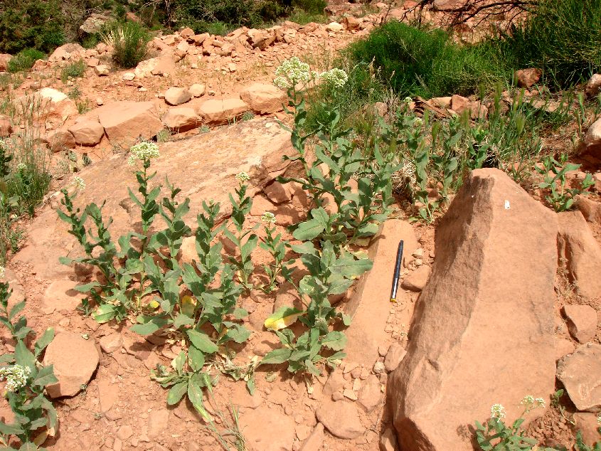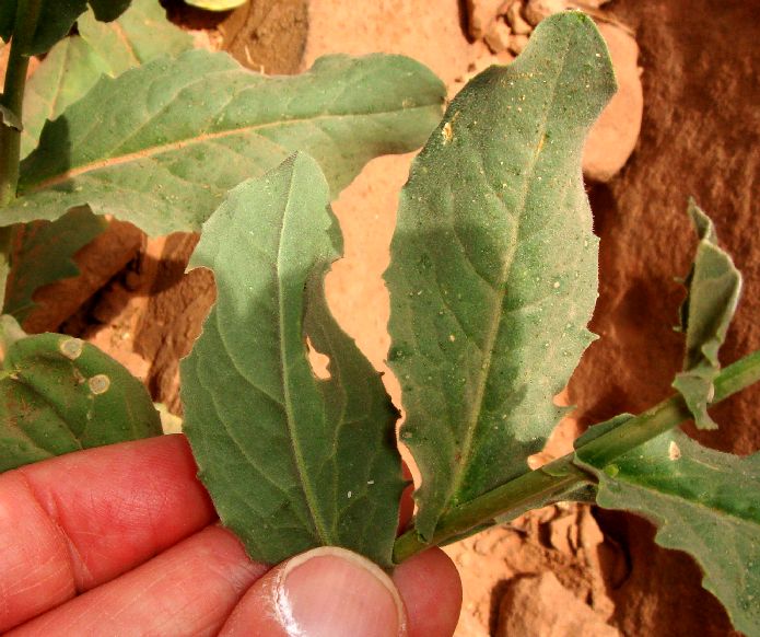 3 Plants perennial; basal leaves dentate; petals about twice as long as the sepals... Lepidium drabaThis BLM Resource Note says that plants of this species just virtually disappear after they finish blooming and the leaves dry up. That may be why these plants were not seen on my survey in September 2007. They also may not have grown in spring 2007 due to the severe drought that season. The first picture below is followed by a link to a picture from September 2007 showing the location of these plants. The September 2007 picture was taken to show the first occurrence of Agave utahensis var. kaibabensis; it was fortuitous that it happened to show the location of the Cardaria as well.