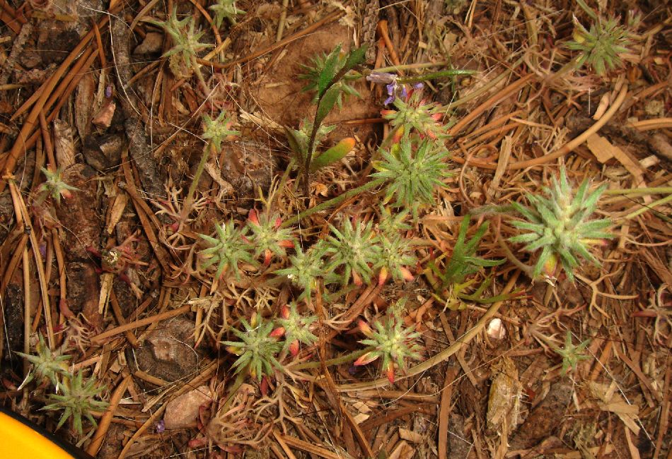 The huge number of tiny plants covering the foreground half of this picture are all C. testiculata. It is possible that the fairly isolated plants at the edges of the distribution are the leading edge of the invasion, and those areas will be dense with plants in the future. As can be seen from the closeup of the fruit above, each flower from each plant produces ~20 seeds.