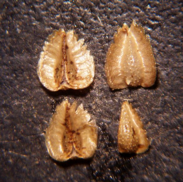 The nutlets on the left show the opposite side relative to the nutlets on the right. The nutlet at bottom right is the odd nutlet, with poorly developed wings, generally found in each flower along with 2-3 of the normal nutlets.