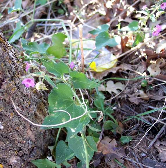 Second, the leaves on the plants here are cordate, which also fits M. oxybaphoides. Although M. pumila can also have cordate leaves, the SEINet picture shows wedge-shaped bases.