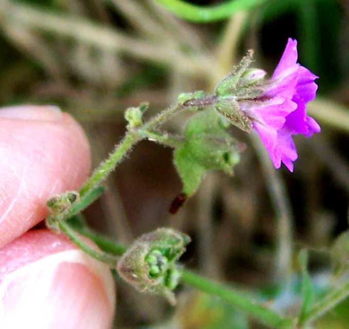 The determination is supported by two other observations, but neither of these other observations can definitively give the determination. First, the flower color of the plants here is purplish red, fitting M. oxybaphoides, whereas the flower color of M. pumila can be either pale pink or purplish. The flowers look exactly like the ones in this picture of M. oxybaphoides, and not like the ones in this picture of M. pumila.