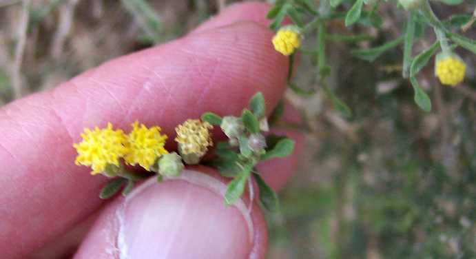 1b. Corollas tubular 3a. Subshrub 4b. No ligules 13b. Pappus of awns 21b. Pappus of 1-2 awns 22b. Heads about 1/4 inch across ....Perityle congestaMy pictures don't show the pappus; I determined that from a flower in the field.