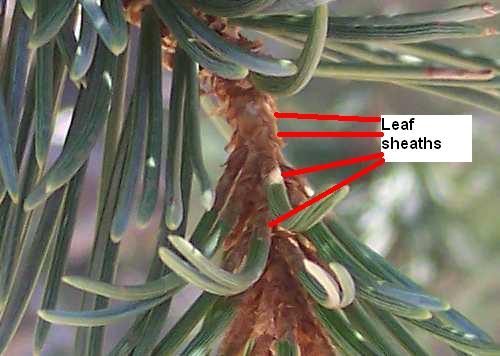 The following picture shows the leaf sheaths, which are just papery bracts that surround the base of the needles. The leaf sheaths remain attached to the stem after the needles drop.