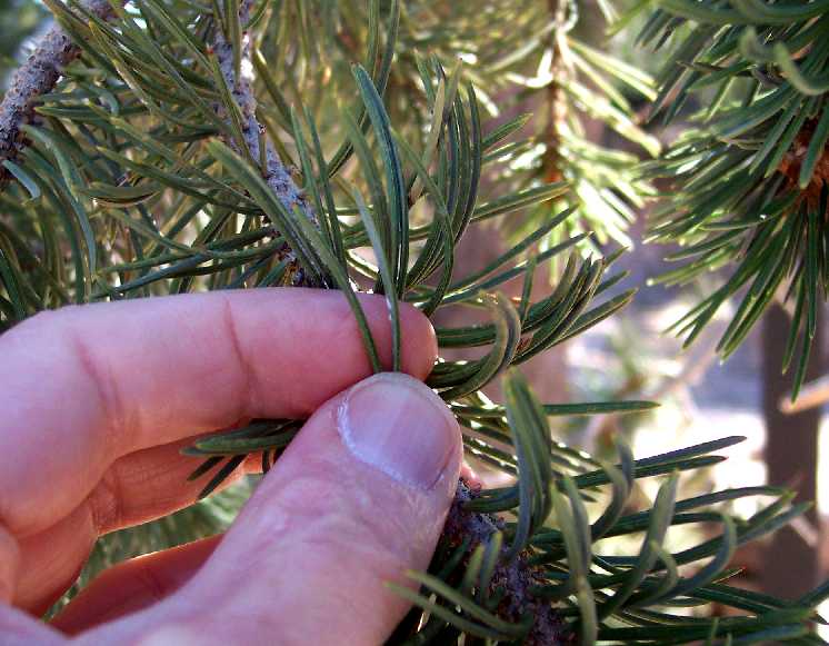 Note that it is sometimes hard to see at a glance how many needles are in a cluster, since the needles are usually close together. I've splayed the needles apart between my thumb and index finger in the following picture: