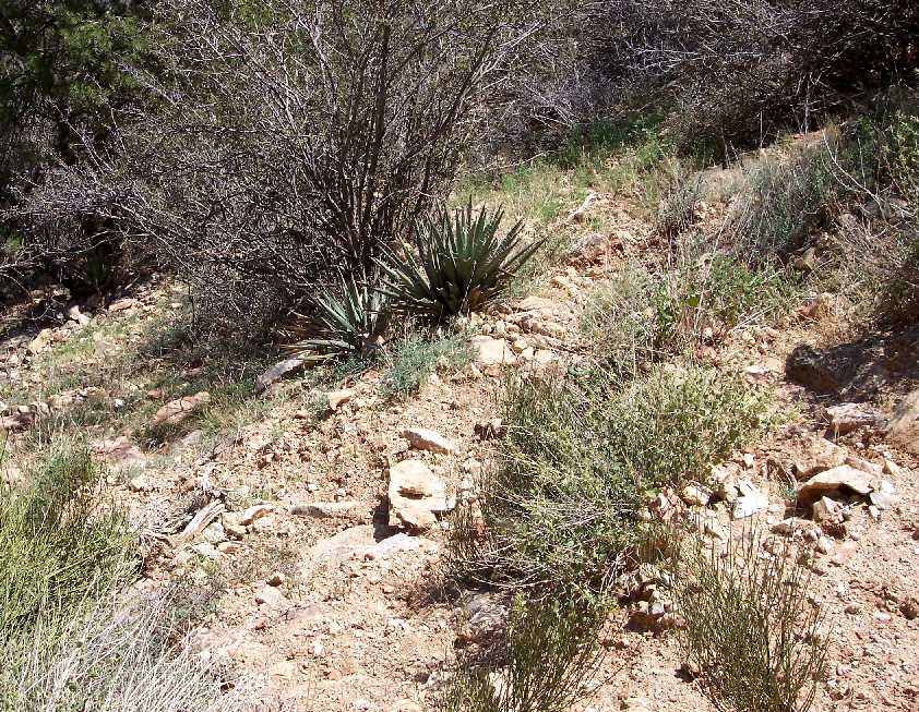 First occurrence on Bright Angel Trail: mile 0.43, elevation 6606 feet (2014 m). The first off-trail specimens are at mile 0.34, elevation 6662 feet (2031 m).