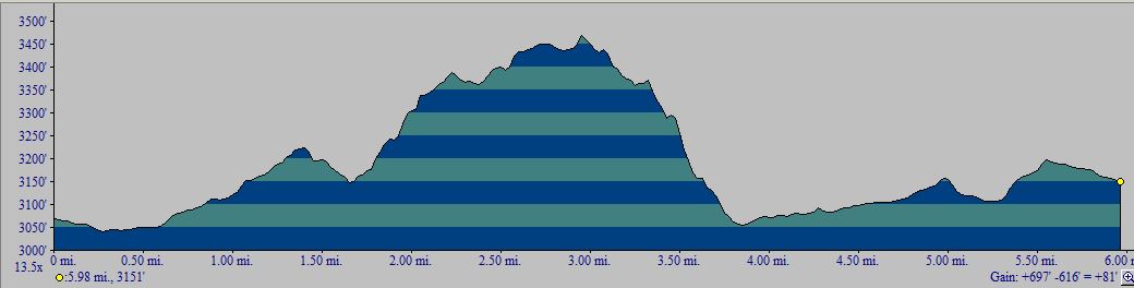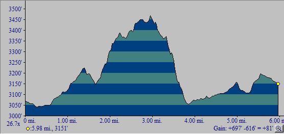 The one-way hike from south to north has a total elevation gain of 570 feet; see the profile below.