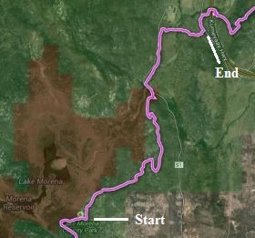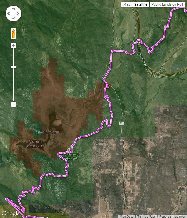 Segment Start Segment End Segment Length Elevation (feet) Min Max Range Lake Morena, 3070 feet Highway 80 (Boulder Creek Campground) 6.3 miles 3040 3460 420 This section covers mile 20 to mile 26 from the Mexican Border (see notes on accuracy of mileages).