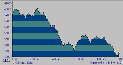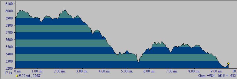 The one-way hike from south to north has a total elevation gain of 820 feet; see the profile below.
