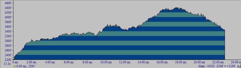 A round-trip hike of this section is 48.0 miles, with an elevation gain and loss of 4740 feet.We have broken up this section into three units. Section A9a is the first 4.2 miles of trail. Section A9b is the middle part of the trail, but since the easiest way to access this is from either end of the trail, we have included it with Section A9a as Section A9ab, which covers the first 18.5 miles of trail. Section A9c is the last 5.5 miles of trail, which we have done from Highway S22 south to the high point of the trail.