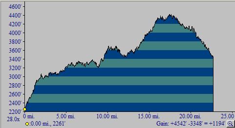 The one-way hike from south to north has a total elevation gain of 2970 feet, and a total elevation loss of 1770 feet see the profile below.