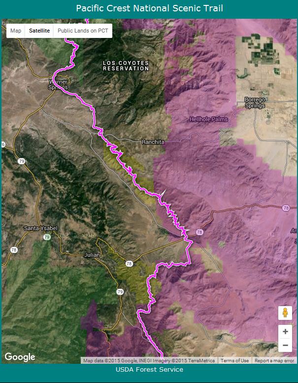 Fig. 4. Left: Trail Map for the PCT Section A9 from Highway 78 to Highway S22, from USDA Forest Service Interactive Map.