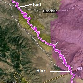 Near mile 13, the trail gets serious about gaining elevation, and crosses the ridgeline of the San Felipe Hills at mile 18.5. The trail then descends to Highway S22 on the northeast side of the ridgeline.