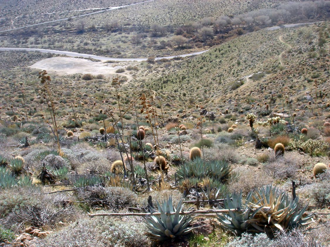 The trail begins in open Borrego Desert vegetation, and gradually transitions to desert chaparral for most of its length. Just before the high point on the trail, chamise chaparral appears, which becomes dense past the high point (Fig. 3). The vegetation at the beginning and end of this segment is completely different (compare Figs. 2 and 3).
