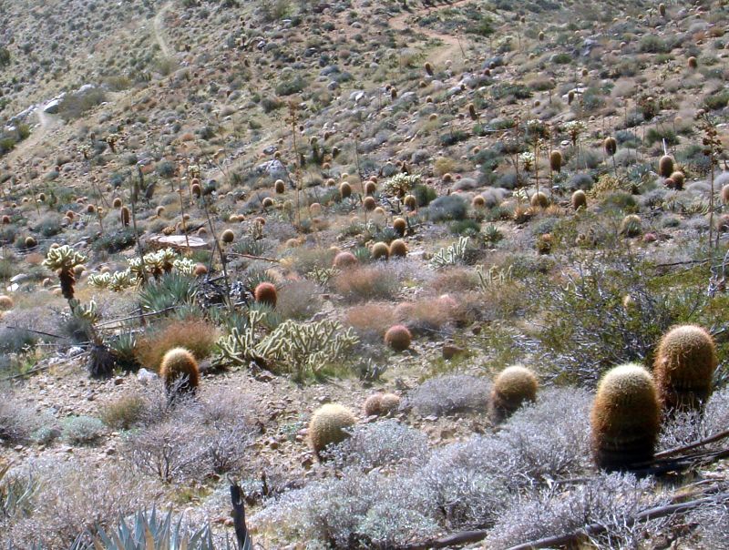 Fig. 2. A dense stand of California barrel cactus, Ferocactus cylindraceus; accompanied by Gander's cholla, Cylindropuntia ganderi; desert agave, Agave deserti; and teddy-bear cholla, Opuntia bigelovii. This is the only section of the PCT with signature plants of the Lower Colorado Desert vegetation.