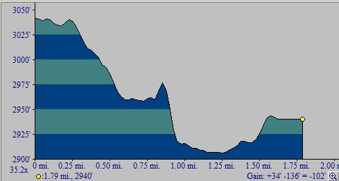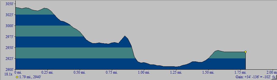The one-way hike from south to north has a total elevation gain of 60 feet; see the profile below.