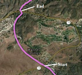 Segment Start Segment End Segment Length Elevation (feet) Min Max Range B2, Highway 79 (Warner Springs fire station) Highway 79 (underpass second crossing) 1.8 miles 2900 3050 150 This section covers rougly mile 110 to mile 112 from the Mexican Border (see notes on accuracy of mileages).