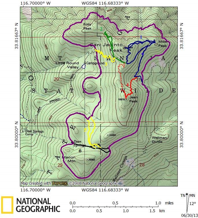 Fig. 2. Map showing the area of San Jacinto Mountain above 10,000 feet elevation, outlined with the purple contour, and the six surveys labeled 1 through 6 from north to south shown in various colors..
