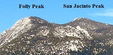 The main ridgeline of the San Jacinto high country runs 2.2 miles north-south, and contains five peaks: Folly Peak, San Jacinto Peak, Jean Peak, "Shirley" Peak, and Marion Mountain. These peaks all have similar elevations, with a maximum difference of just 480 feet. In the same order, the elevations are ~10,500; 10,842; 10,670; 10,388; and 10,362 feet. The minimum elevation of the saddles between the northern peaks is 10,400 feet, decreasing to 10,200 feet at the southernmost saddle. The width of the flattish part of the ridgetop is ~1 mile on the north, from Folly Peak to Miller Peak, and about a half mile on the south.