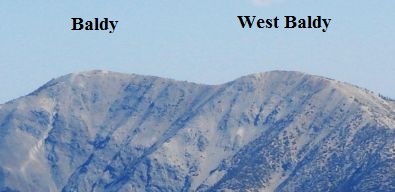 Fig. 1. Top: view of the Folly Peak / San Jacinto Peak ridgeline from the west. Note the extensive tree cover except for the precipitous north slope on the left and on minor rock outcrops. Bottom: view of the Mt. Baldy / West Baldy ridgeline from the north. Each set of peaks is about 0.5 miles apart. Note that Mt. Baldy is aptly named, with no trees present near the ridgeline, even on the north-facing slope shown here. Mt. Baldy also has a flatter profile and a more gently rounded ridgeline.