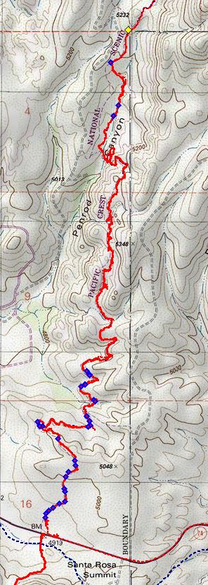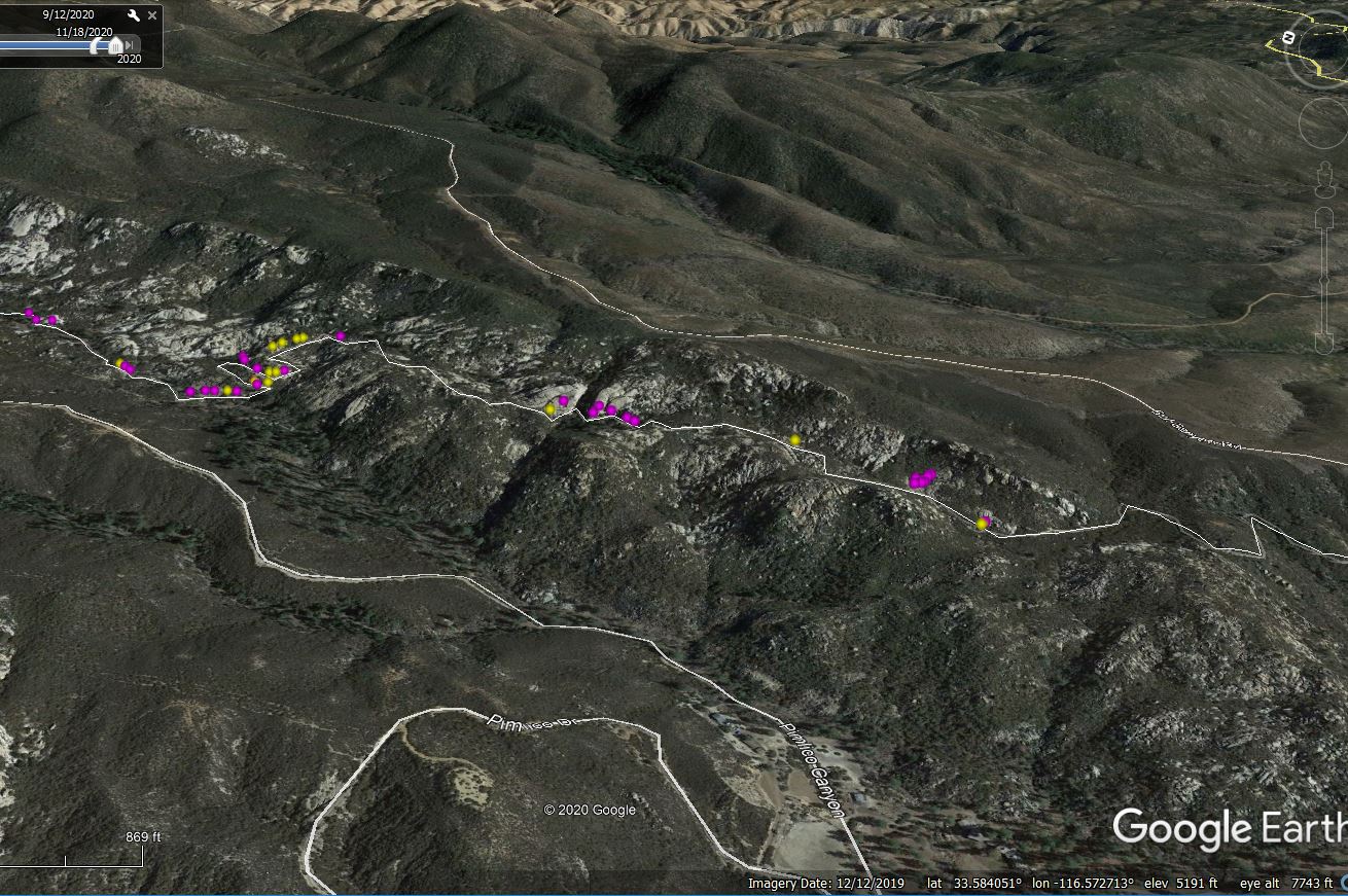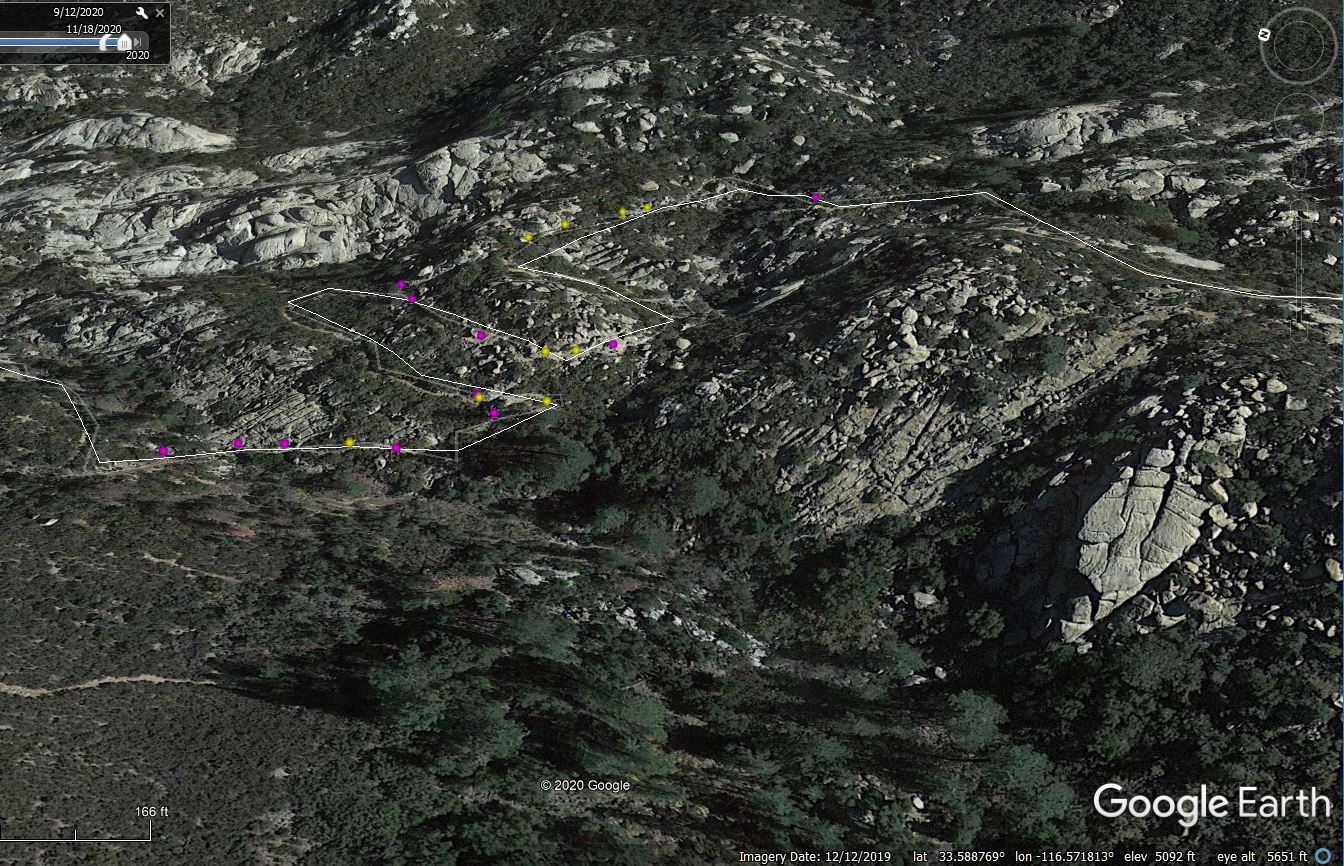 See also a Google Earth view of the bouldery area of mile 2 to 4 of the PCT, looking east and an enlarged view of the descent to Penrod Creek of mile 3.0 to 3.4. Both images show locations of Ericameria cuneata (pink dots) and Diplacus calycinus = Mimulus auriantiacus var. pubescens in part (yellow dots).