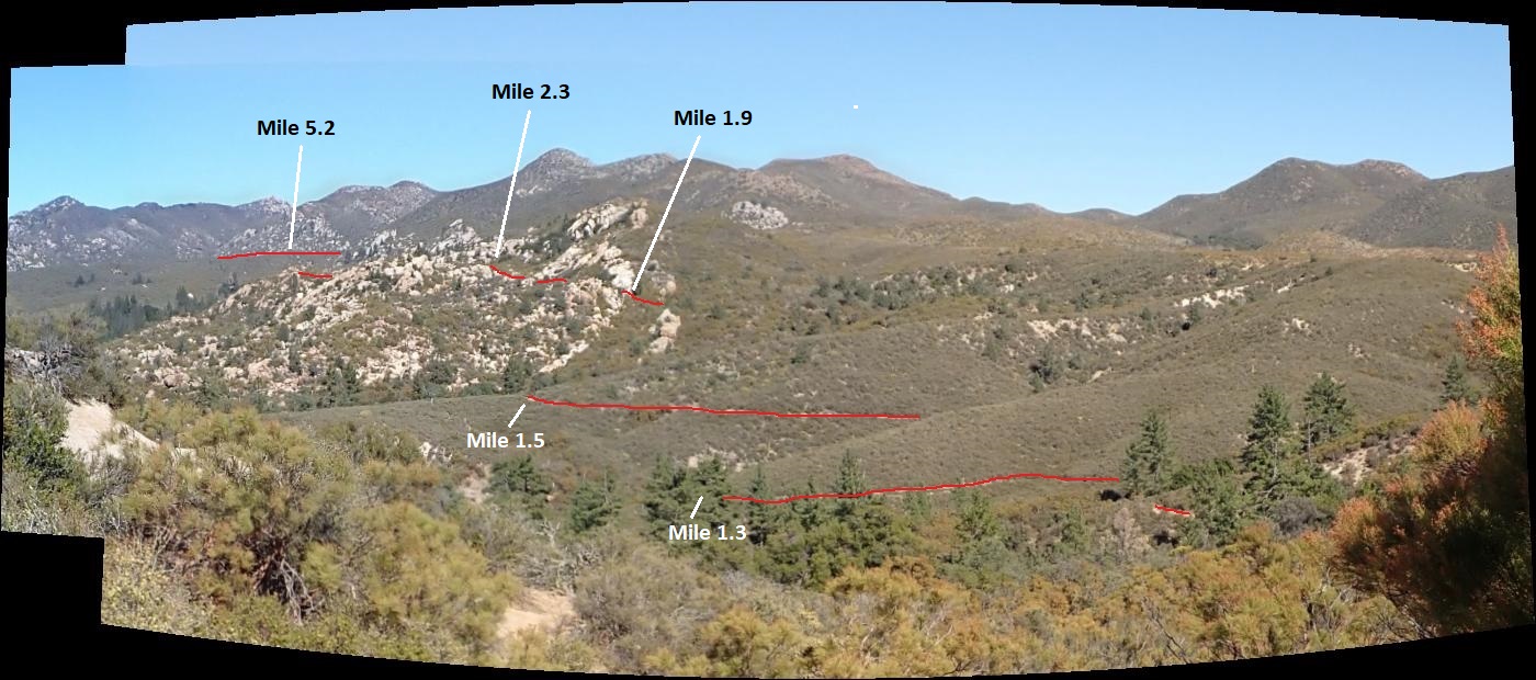 Plant Guide to Pacific Crest Trail North of SR74, San Jacinto Mountains - Garner Valley Area Fig. 1. View to the north from mile 0.55 of the PCT, showing the interesting bouldery area traversed by this section of the PCT, with visible sections of the trail labeled by mileage from SR74. Click on the photo see a larger area.