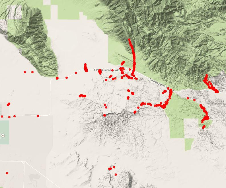 - A loop from the Borrego Dump site, through the Borrego Dunes into the Borrego Badlands Area on 20 February 2009 (by Tom Chester, Michael Charters and Dave Stith). This survey was partially in the Borrego Valley area, and partially in the Borrego Badlands area. It has not yet been processed for the flora on this page.