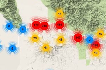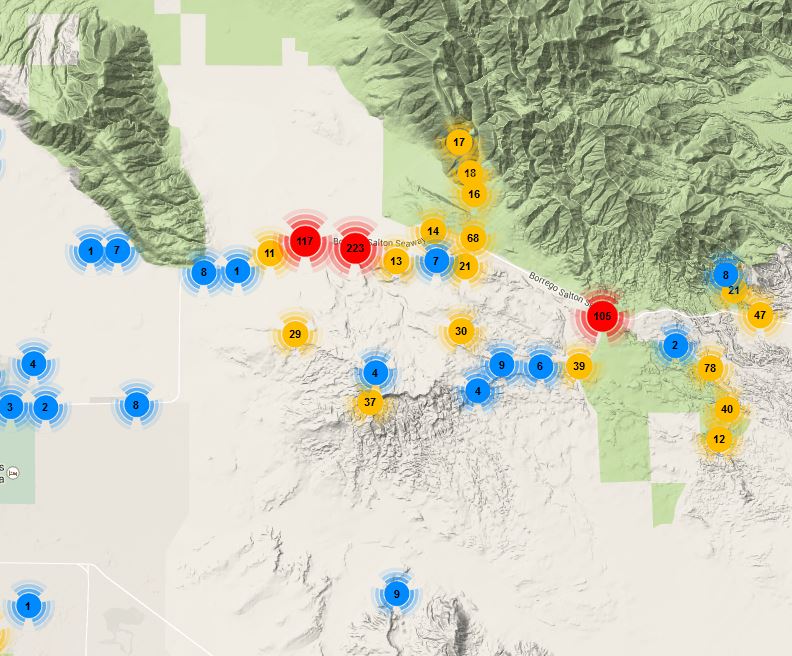Fig. 2. Locations where we have recorded GPS points for individual species in the Borrego Badlands area as of 15 December 2014. GPS Points from later surveys are not yet included in these maps. Left: map of individual GPS points. Note that some locations have as many as 40 species recorded at the same point. Right: cluster version showing how many points are in each area.