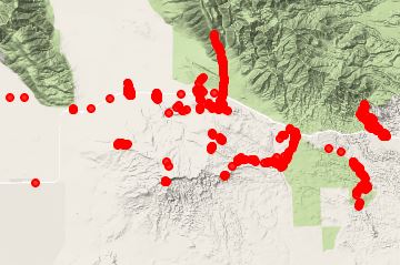 - A 5.5 mile loop from the beginning of the Thimble Trail at S22, to roughly south 0.7 miles, then west 2.3 miles toward the hill called Paint on the topo map near Fonts Point Wash, then return on the north side of those Badlands Hills. This survey was done by Tom Chester, Keir Morse, Adrienne Ballwey, and Whitney Meier on 10 December 2014, finding 41 species.