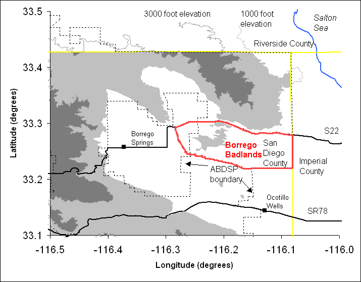 The western area includes all of what is marked as the Borrego Badlands on the topographic map, plus additional non-badland area. This floristic area is extended to the east to the Imperial County Line since that eastern area is similar in many respects to the Badlands. The northern boundary is arbitrarily set along Highway S22 for convenience and clarity. The southern boundary is set to exclude the Borrego Sink Wash, San Felipe Creek, and the Ocotillo Wells Off-Road Vehicle Area.
