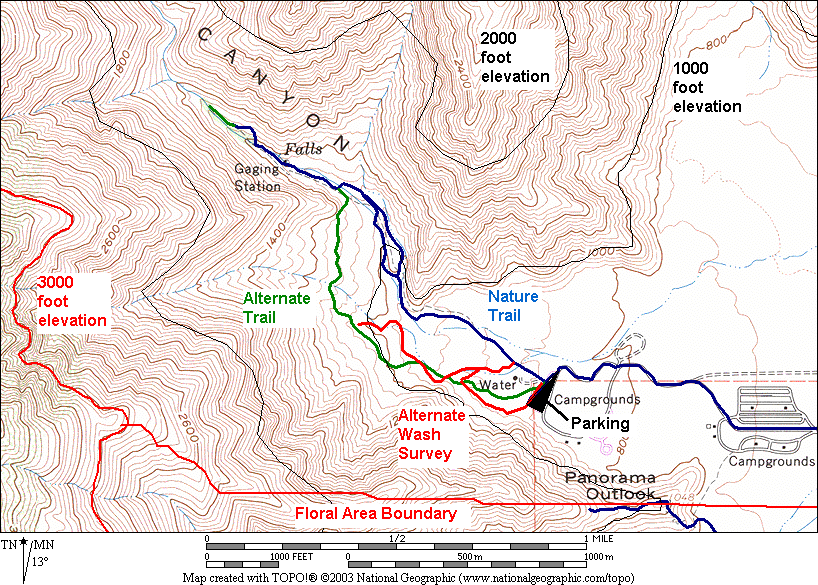 Nearly all of this area in the Canyon is very rugged and has not been explored botanically. The main area of previous study is along the stream and the trails, shown in detail in the next map: