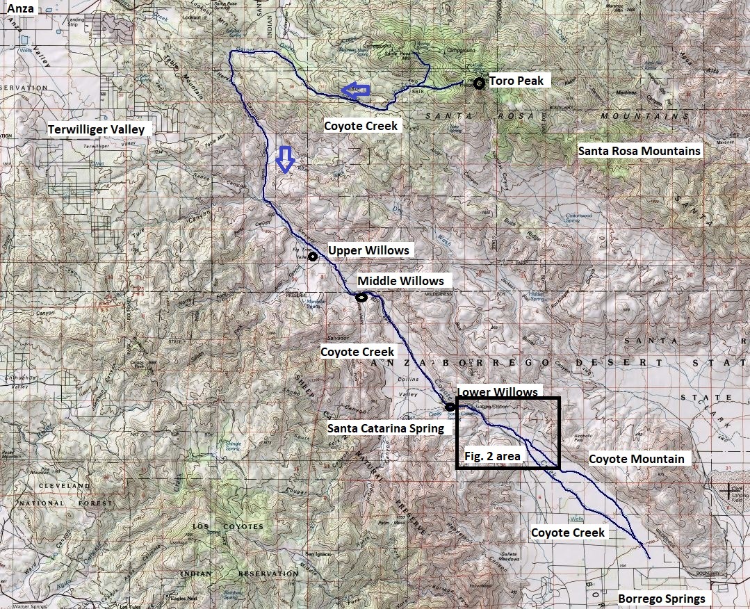 Introduction Coyote Creek drains most of the southwest quadrant of the Santa Rosa Mountains, originating on the southwest side of Toro Peak at 8716 feet elevation, first flowing west toward the town of Anza; then making a 90° turn to flow south in Horse Canyon; and then making a 45° turn to flow along a branch of the San Jacinto Fault, ending in the Borrego Valley at an elevation of about 700 feet.