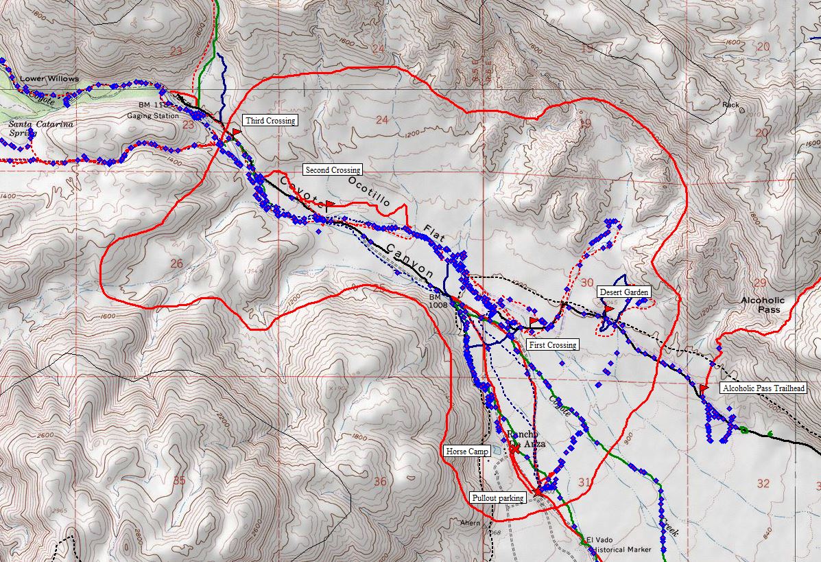Fig. 2. The Coyote Creek First to Third Crossing Area. The solid red perimeter line delineates the area used for this flora. The blue diamonds are where we have recorded GPS points for species in the entire area as of 10 December 2017; only the ones inside the solid red boundary perimeter are used for this flora. The other lines give our survey routes. Not all survey routes have recorded GPS points.