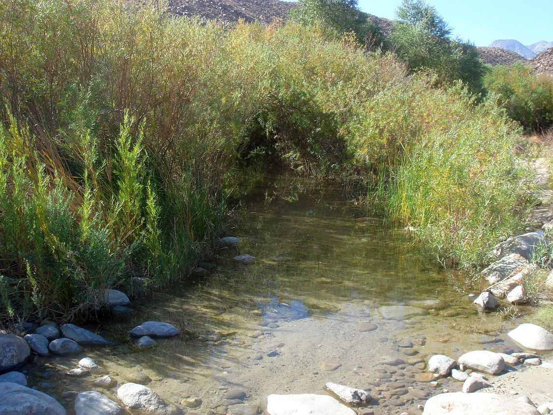 Bedrock bottlenecks force its water to come to or near the surface at Upper, Middle and Lower Willows. Santa Catarina Spring at Lower Willows covers an area of several acres and is the largest single natural emergence of water in San Diego County (Anza-Borrego A to Z, Lindsay 2001, p. 310). Water from the spring creates a year-round flow of water at Lower Willows through Lower Coyote Canyon, a narrow canyon which abruptly opens to the desert floor, with its deep sandy alluvial soils. The water begins to sink into its sandy bed and above-ground flow eventually ends.