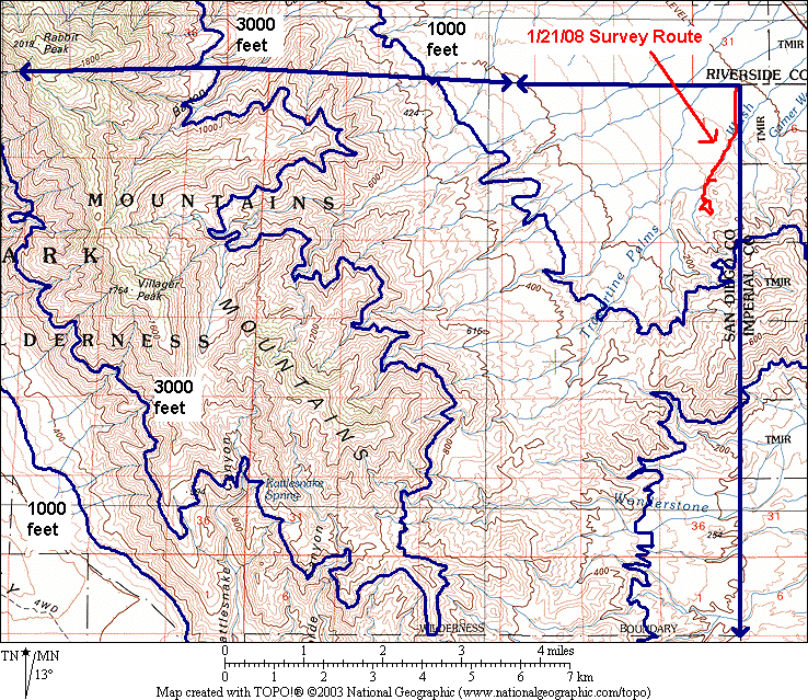 - 0.9 miles from the exact northeast corner of the county south to Travertine Palms Wash, just inside the county line. This area consists almost entirely of zillions of braided washes, with quite a large area of cryptobiotic crust found in patches between the active washes.