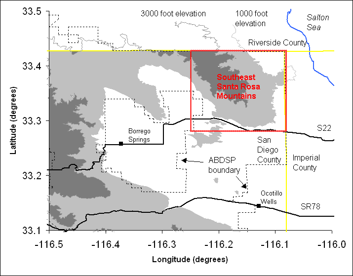 The general location of the southeast Santa Rosa Mountains is delineated by the red rectangle in the following map: