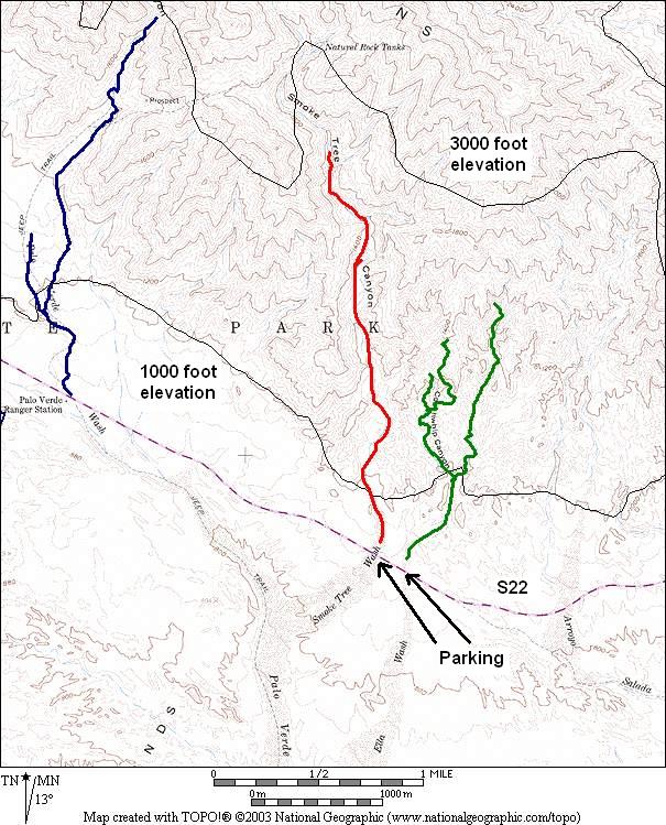 There is a fairly large area for parking along either side of the road at mile marker 34.5 on S22 for Smoke Tree Canyon, and at mile marker 34.8 for Coachwhip Canyon.