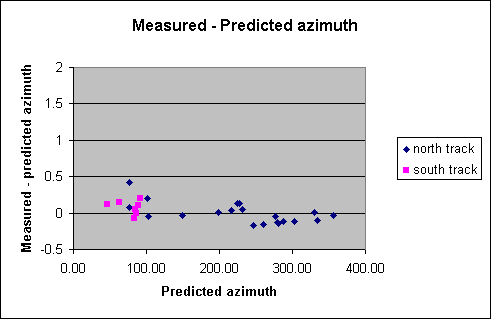 The mean of all the azimuth differences was about 0.1°. Since it was expected that there would be some error in the alignment of the Osborne with true North, I subtracted that mean from the raw observed azimuth angles to produce corrected observed azimuth angles. In the following, I define the delta azimuth angle to be the corrected observed angle minus the predicted angle.