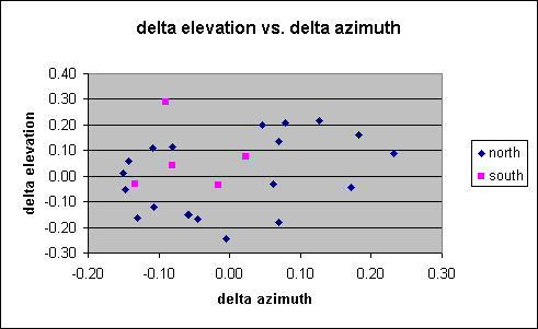 The 0.14° scatter of the delta azimuth angles is much larger than the value of 0.04° expected from the root sum square combination of input coordinate errors (~0.02° for azimuth) and the precision I used in reading the azimuth angles from the Osborne (±0.05°, equivalent to a sigma of 0.03°). (The scatter is defined as one sigma, the average value of the squared delta angles.) This larger scatter is caused by a trend in the residuals seen clearly in the plot. Nearly all are positive for azimuths of 50-220° and nearly all are negative for azimuths of 230-360°. This pattern is not correlated with elevation angle, as seen from examining the peak location plot mentioned earlier. Investigation into the cause of this pattern will be done next.