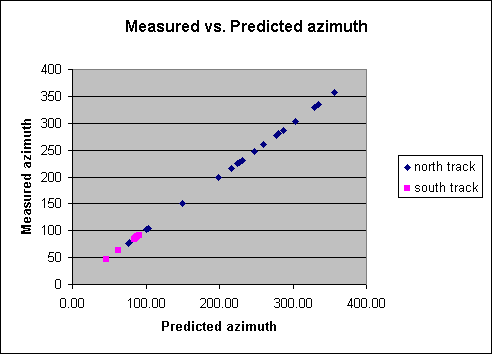 Consider first the azimuthal values. The measured azimuths agree well with the predicted azimuths, as mentioned above. Since most of the data were taken using the northernmost set of rails, the average difference between the observed azimuth and the predicted azimuth for that subset of the data was taken to be the error in orienting the Osborne finder to true North. That average difference was 0.12°. Hence I corrected all measured azimuths (including the southernmost data) by subtracting 0.12° from them, producing the "corrected azimuth angles".