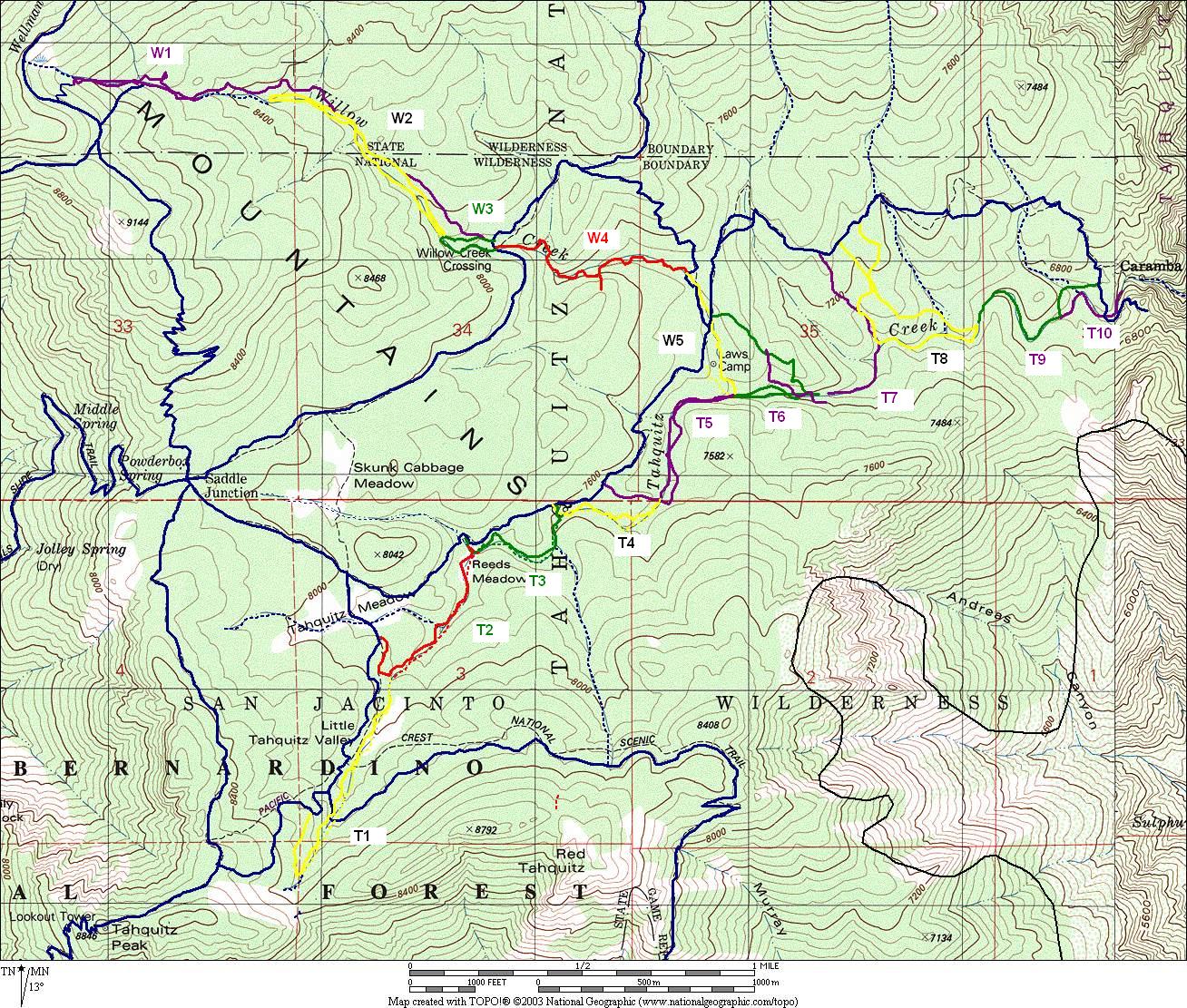 In the middle map above, the individual surveys are color-coded and numbered in order of descending elevation, with the prefix W for the Willow Creek portions, the prefix T for the Tahquitz Creek portions. A table below gives details on each individual survey. The last two maps above show the entire survey route for each trip, including the non-creek portion.